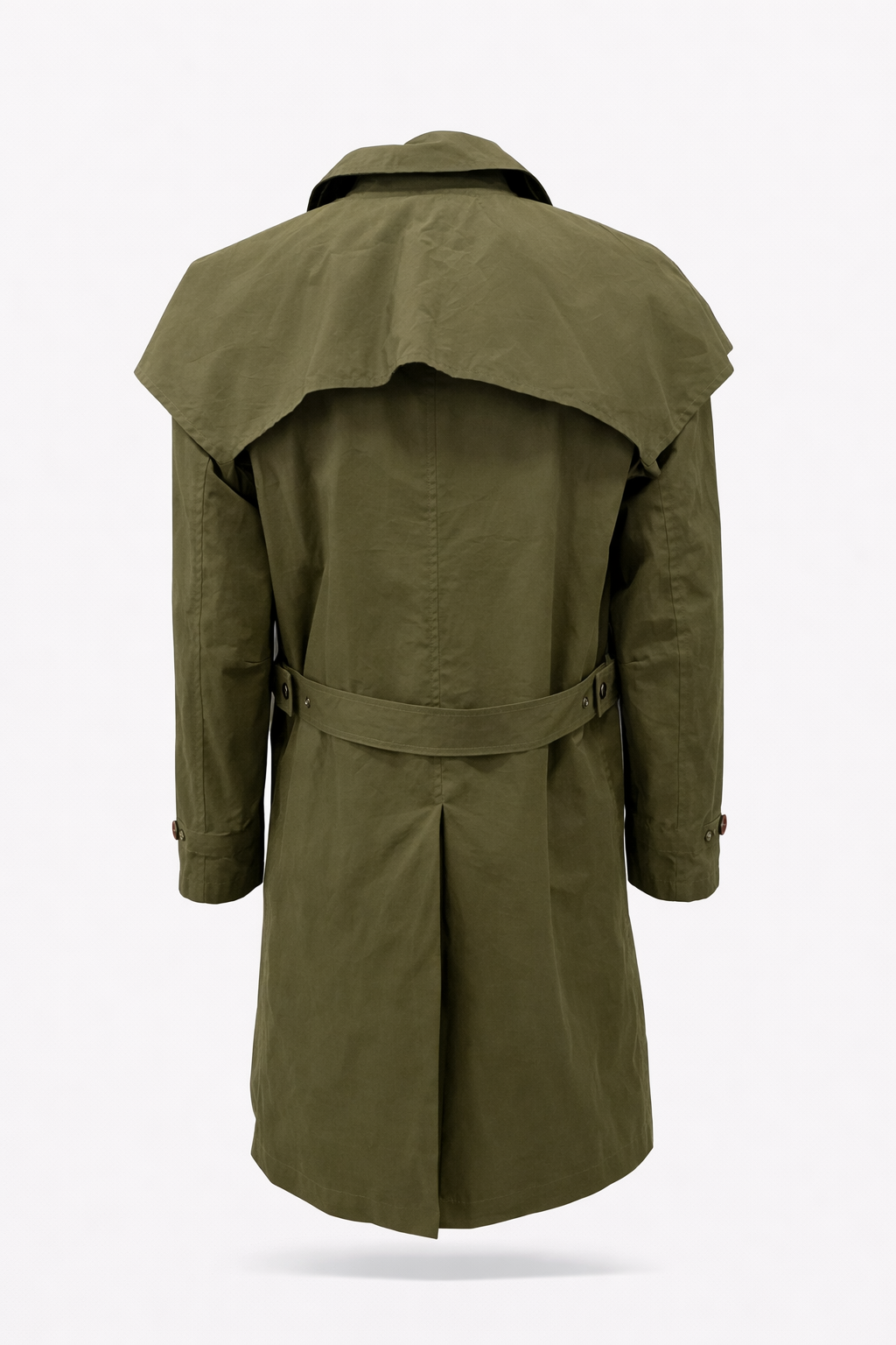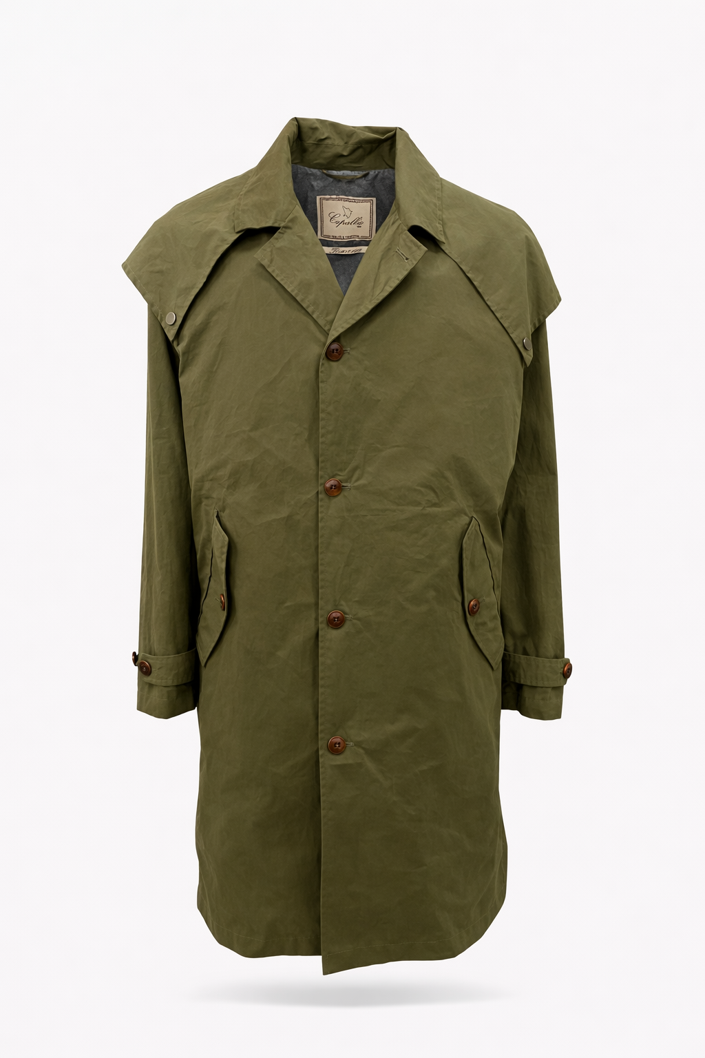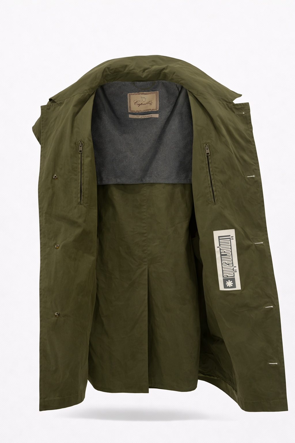 Trench in cotone waxed originale Capalbio Abbigliamento con mantellina rimovibile, due tasche laterali e due tasche interne con zip, spacco posteriore e cintura posteriore regolabile.